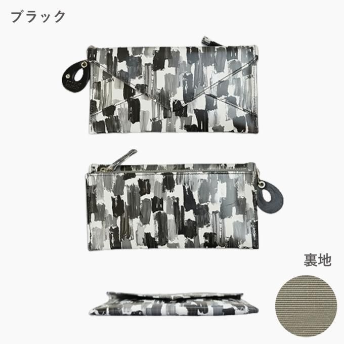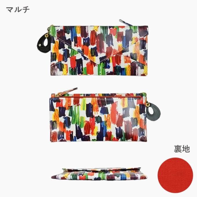 軽くてきめ細かい山羊革に、大人モード、大胆なペインティングプリントを施しました。シティ感覚・シャープなブラックと、上品カラフルなマルチの2色展開。ファッションアイテムのワンポイントアクセントにも、ミニバッグ感覚でお楽しみください。牛革ではなく山羊革のきめの細かさだから出せる発色のペインティングプリント柄。チャームには牛革スムースにストーンでアクセントを。マルチとブラックで、金具色を本金メッキとシルバーに作り分けるこだわりです。