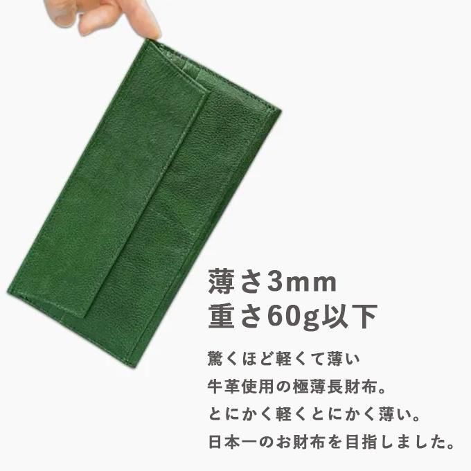 | ●薄さ3mm、重さ60g以下。 驚くほど軽く、そして薄い、牛革使用の極薄長財布。 とにかく軽く、とにかく薄い、日本一のお財布を目指しました。 |