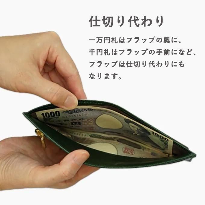 | フラップが付いていますので、 お札やカードが丸見えにならない 仕組みになっています。 | 一万円札はフラップの奥に、 千円札はフラップの手前に入れるなど、 フラップは仕切り代わりにもなります。 |