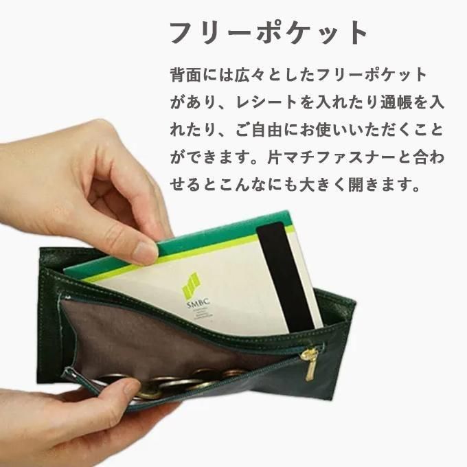 | 小銭入れ部分のファスナーは、 片マチ仕様になっているので、 開けたときに小銭が見やすく 取り出しやすい設計になっています。 | ロゴ側には広々としたオープンポケットがあり、 レシートを入れたり通帳を入れたり、 ご自由にお使いいただくことができます。 片マチファスナーと合わせると こんなにも大きく開きます。 |