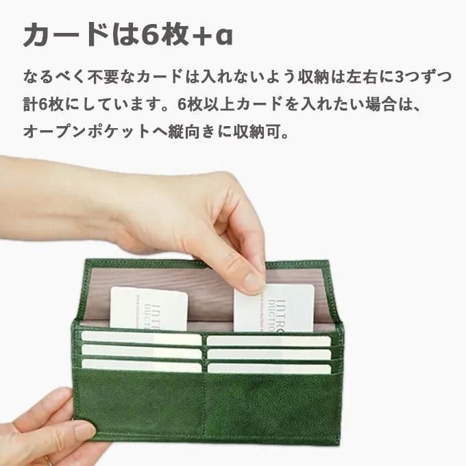 | 光沢感があり、なめらかな手触りの裏地で、 お札の出し入れもスムーズです。 国産10番シャンタンを使用していて、 発色が美しく、摩擦に強く、 汚れがつきにくい裏地となります。 | なるべく不要なカードは入れないように 収納は左右に3つずつ計6枚にしています。 6枚以上カードを入れたい場合は、 オープンポケットへ縦向きに収納可。 |